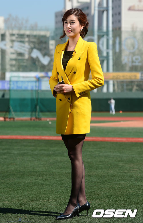 21일 오후 서울 목동구장에서 열리는 '2013 한국야쿠르트 세븐 프로야구' 넥센 히어로즈와 두산 베어스의 시범경기 시작 전 MBC 신입 아나운서 차예린이 촬영을 하고 있다.
