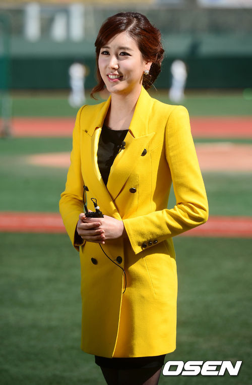 21일 오후 서울 목동구장에서 열리는 '2013 한국야쿠르트 세븐 프로야구' 넥센 히어로즈와 두산 베어스의 시범경기 시작 전 MBC 신입 아나운서 차예린이 촬영을 하고 있다.