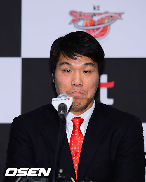 21일 오전 서울 종로구 KT 광화문 올레 스퀘어 1층 드림홀에서 열린 농구선수 서장훈의 은퇴 기자회견에서 서장훈이 강동희 감독 사태에 대한 질문을 받자 말문이 막히며 가슴아프다고 말을 했다.