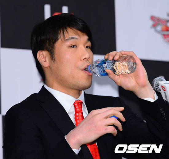 21일 오전 서울 종로구 KT 광화문 올레 스퀘어 1층 드림홀에서 열린 농구선수 서장훈의 은퇴 기자회견에서 서장훈이 물을 마시고 있다.