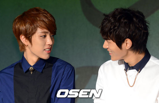 21일 오후 서울 영등포구 여의도 IFC몰 MPUB에서 열린 '인피니트 컴백 기자회견'에서 인피니트 멤버 성열과 엘이 이야기를 나누고 있다.