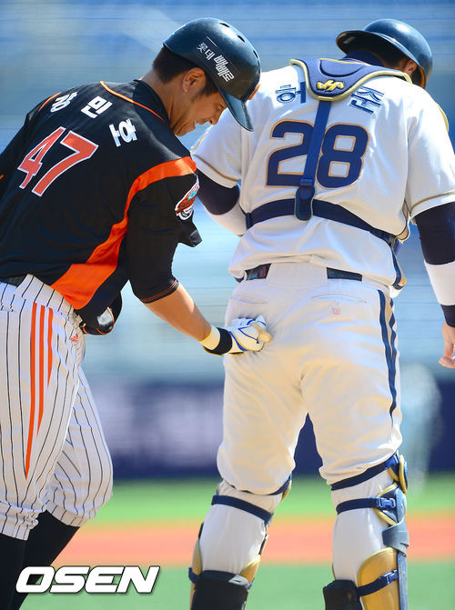 21일 오후 창원시 마산구장에서 열린 '2013 한국야쿠르트 세븐 프로야구' NC 다이노스와 롯데 자이언츠의 시범경기, 1회초 2사 1루 NC 찰리 투수의 공에 맞은 롯데 강민호가 허준 포수에게 화풀이하며 진루하고 있다.
