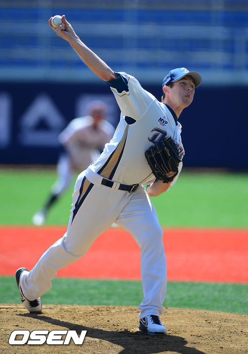 21일 오후 창원시 마산구장에서 열린 '2013 한국야쿠르트 세븐 프로야구' NC 다이노스와 롯데 자이언츠의 시범경기, 1회초 NC 찰리 선발투수가 역투하고 있다
