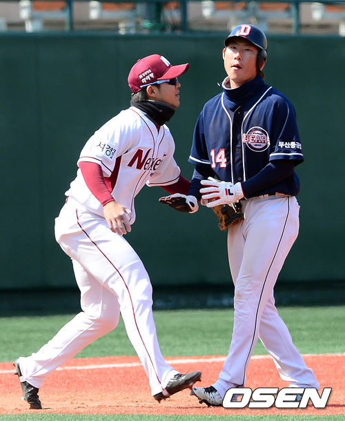 21일 오후 서울 목동구장에서 열린 '2013 한국야쿠르트 세븐 프로야구' 넥센 히어로즈와 두산 베어스의 시범경기 2회초 1사 1,2루 정수빈의 타석, 도루를 시도하던 2루주자 고영민이 김민성에 태그아웃 당하고 있다.
