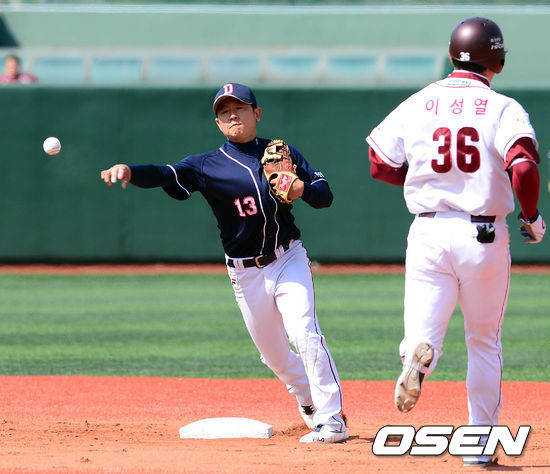 21일 오후 서울 목동구장에서 열린 '2013 한국야쿠르트 세븐 프로야구' 넥센 히어로즈와 두산 베어스의 시범경기 2회말 1사 1루 김민성의 병살타구를 손시헌이 2루에서 포스아웃 시키고 1루로 송구하고 있다.