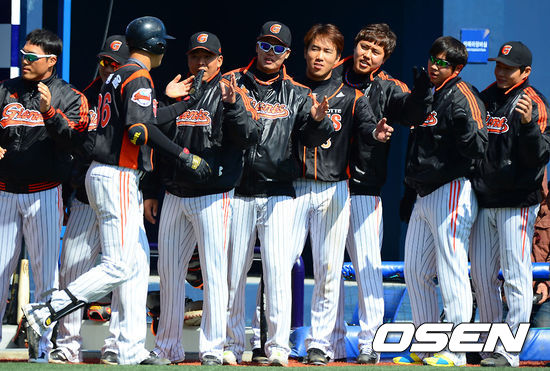 21일 오후 창원시 마산구장에서 열린 '2013 한국야쿠르트 세븐 프로야구' NC 다이노스와 롯데 자이언츠의 시범경기, 4회초 무사 1루 롯데 박종윤이 역전 2점 홈런을 날리고 동료들과 하이파이브를 하고 있다
