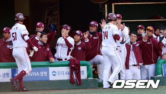 21일 오후 서울 목동구장에서 열린 '2013 한국야쿠르트 세븐 프로야구' 넥센 히어로즈와 두산 베어스의 시범경기 6회말 2사 2,3루 대타 이택근의 2타점 2루타에 홈을 밟은 장기영 서건창이 덕아웃에서 동료들과 하이파이브를 하고 있다.
