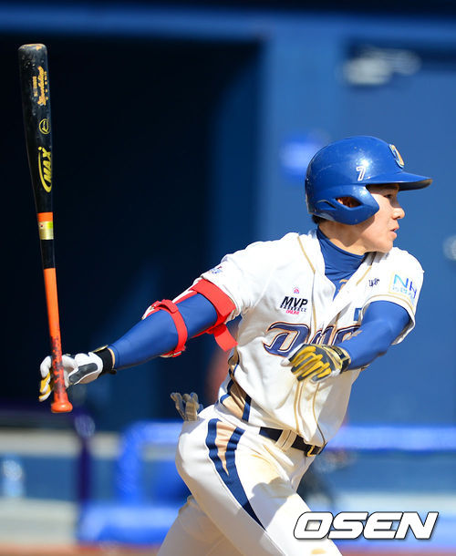 21일 오후 창원시 마산구장에서 열리는 '2013 한국야쿠르트 세븐 프로야구' NC 다이노스와 롯데 자이언츠의 시범경기,7회말 무사 만루 NC 박민우가 3타점 적시타를 날리고 있다