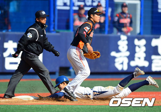 21일 오후 창원시 마산구장에서 열리는 '2013 한국야쿠르트 세븐 프로야구' NC 다이노스와 롯데 자이언츠의 시범경기,7회말 무사 만루 NC 박민우가 3타점 적시타를 날리고 3루에 세이프되고 있다