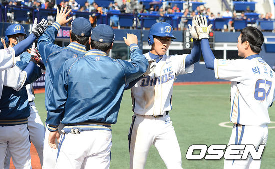 21일 오후 창원시 마산구장에서 열리는 '2013 한국야쿠르트 세븐 프로야구' NC 다이노스와 롯데 자이언츠의 시범경기,7회말 무사 만루 NC 박민우의 역전 3타점 적시타때 득점한 조영훈, 박으뜸, 노진혁이 동료들의 축하를 받고 있다.
