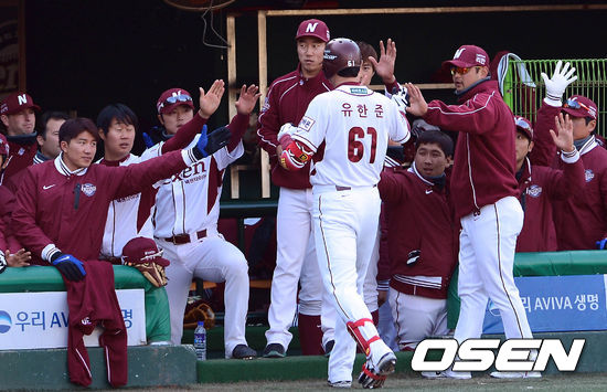 21일 오후 서울 목동구장에서 열린 '2013 한국야쿠르트 세븐 프로야구' 넥센 히어로즈와 두산 베어스의 시범경기 7회말 1사 만루 유한준이 희생플라이를 치고 덕아웃으로 향하며 동료들의 응원을 받고 있다.
