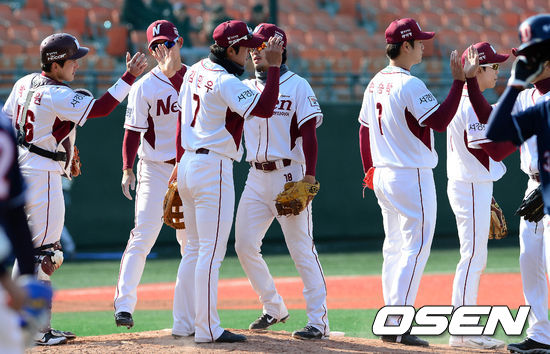 21일 오후 서울 목동구장에서 열린 '2013 한국야쿠르트 세븐 프로야구' 넥센 히어로즈와 두산 베어스의 시범경기 종료 후 넥센 선수들이 하이파이브를 하고 있다.