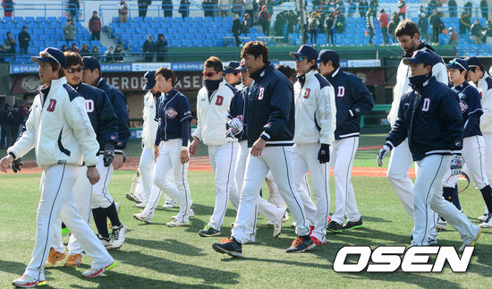 21일 오후 서울 목동구장에서 열린 '2013 한국야쿠르트 세븐 프로야구' 넥센 히어로즈와 두산 베어스의 시범경기 종료 후 두산 선수들이 그라운드를 빠져나가고 있다.