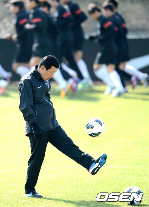 21일 오후 경기 파주 축구 국가대표팀 트레이닝 센터(NFC)에서 열린 대표팀 훈련에서 최강희 감독이 스트레칭을 하고 있다.