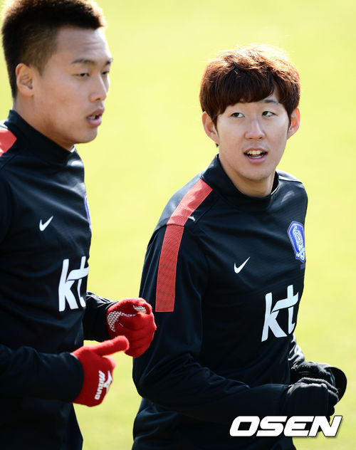 21일 오후 경기 파주 축구 국가대표팀 트레이닝 센터(NFC)에서 열린 대표팀 훈련에서 김신욱과 손흥민이 러닝 훈련을 하고 있다.