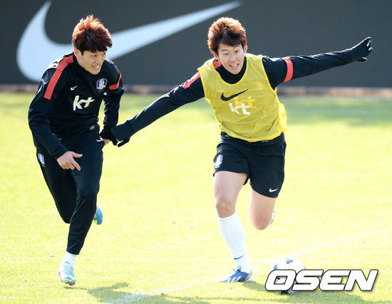 21일 오후 경기 파주 축구 국가대표팀 트레이닝 센터(NFC)에서 열린 대표팀 훈련에서 손흥민이 이청용의 수비를 피해 드리블 돌파를 시도하고 있다.