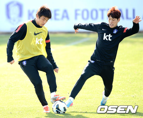 21일 오후 경기 파주 축구 국가대표팀 트레이닝 센터(NFC)에서 열린 대표팀 훈련에서 윤석영과 이청용이 볼다툼을 하고 있다.