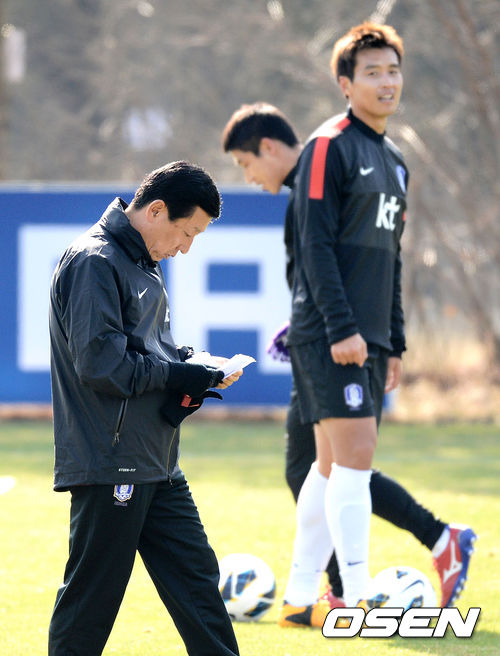 21일 오후 경기 파주 축구 국가대표팀 트레이닝 센터(NFC)에서 열린 대표팀 훈련에서 최강희 감독이 훈련표를 바라보고 있다.