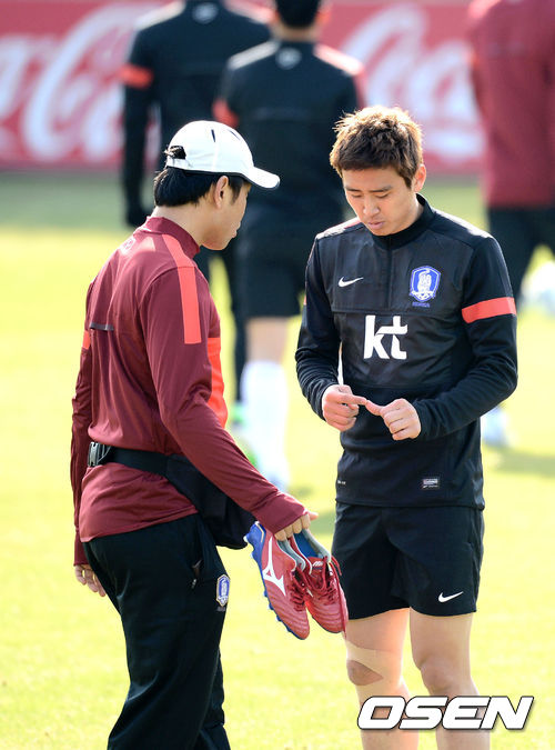 21일 오후 경기 파주 축구 국가대표팀 트레이닝 센터(NFC)에서 열린 대표팀 훈련에 앞서 구자철이 트레이너와 이야기를 하고 있다.