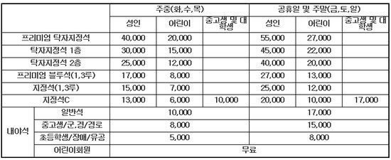 내야석 기준으로는 일반석 1만원, 중고생을 비롯한 군경, 경로자가 8000원, 어린이(초등학생)를 비롯한 국가유공자, 장애인이 5000원이다.