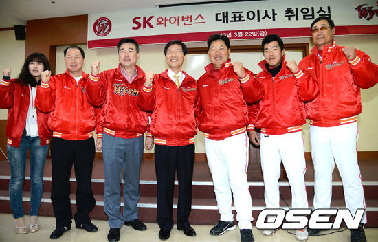 22일 오전 인천 문학야구장 내 위생교육장에서 열린 SK 와이번스 대표이사 취임식에서 김이경 매니저, 장순일 그룹장, 민경삼 단장, 임원일 대표이사, 이만수 감독, 주장 정근우, 김용희 2군 감독이 기념촬영을 하고 있다.