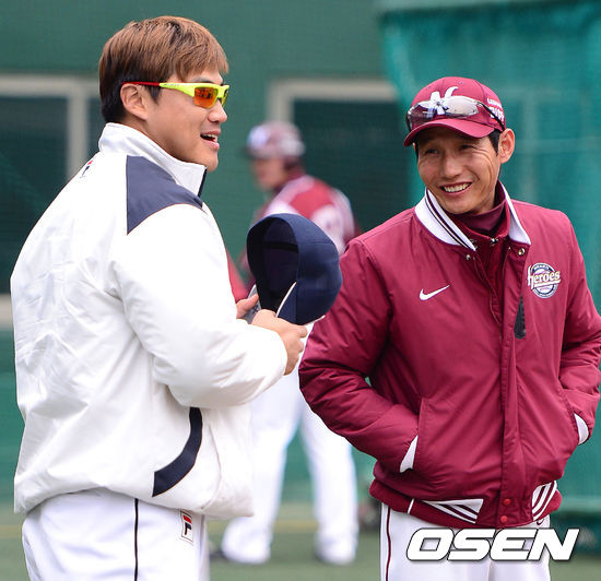 22일 오전 서울 목동구장에서 열리는 '2013 한국야쿠르트 세븐 프로야구' 넥센 히어로즈와 두산 베어스의 시범경기전 넥센 염경엽 감독와 두산 홍성흔이 이야기를 나누고 있다.