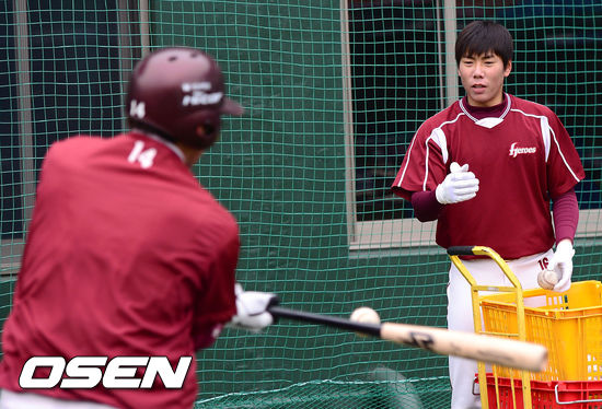 22일 오전 서울 목동구장에서 열리는 '2013 한국야쿠르트 세븐 프로야구' 넥센 히어로즈와 두산 베어스의 시범경기전 넥센 강정호가 서건창에게 배팅볼을 던져주고 있다.