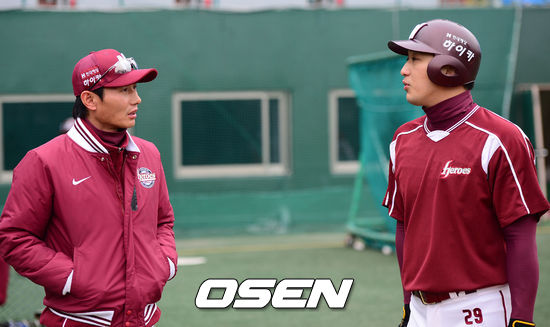 22일 오전 서울 목동구장에서 열리는 '2013 한국야쿠르트 세븐 프로야구' 넥센 히어로즈와 두산 베어스의 시범경기전 넥센 염경엽 감독이 이택근과 이야기를 나누고 있다.