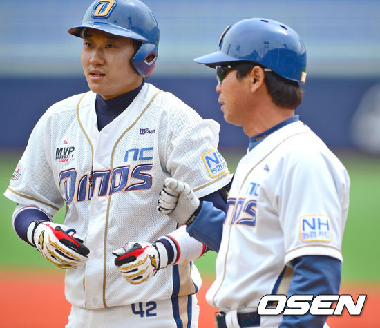 21일 오후 창원시 마산구장에서 열린 '2013 한국야쿠르트 세븐 프로야구' NC 다이노스와 롯데 자이언츠의 시범경기,2회말 1사 2,3루 NC 김태군이 선취 1타점 적시타를 날리고 전준호 코치와 하이파이브를 하고 있다