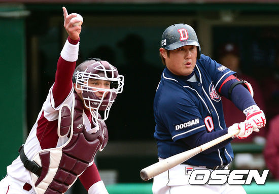 22일 오후 서울 목동구장에서 열린 '2013 한국야쿠르트 세븐 프로야구' 넥센 히어로즈와 두산 베어스의 시범경기, 4회초 1사 1루 넥센 박동원이 두산 최준석의 체크스윙을 확인하고 있다.