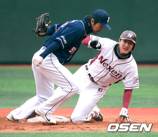 22일 오후 서울 목동구장에서 열린 '2013 한국야쿠르트 세븐 프로야구' 넥센 히어로즈와 두산 베어스의 시범경기, 5회말 2사 1루 넥센 유한준이 2루 도루를 시도하다 오재원에게 태그아웃 당한뒤 심판을 바라보고 있다.