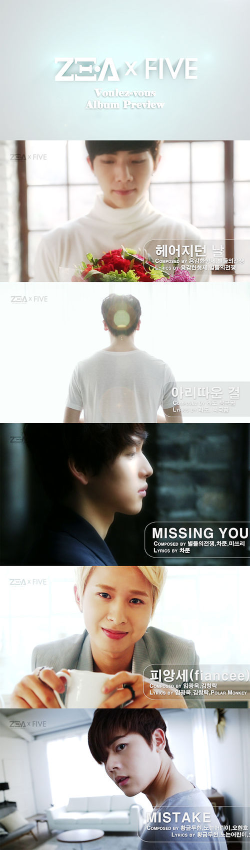 제아파이브는 22일 공식 유튜브채널을 통해 수록곡 ‘아리따운 걸’, ‘피앙세’, ‘미스테이크’, ‘헤어지던 날’, ‘미씽유’의 테마에 맞춰 수줍은 고백으로 사랑이 시작되는 단계부터 남자의 순간적인 실수로 이별을 맞게 되고 가슴 아픈 후회를 그리는 모습까지 가슴아픈 이별의 과정을 담은 영상을 공개했다.