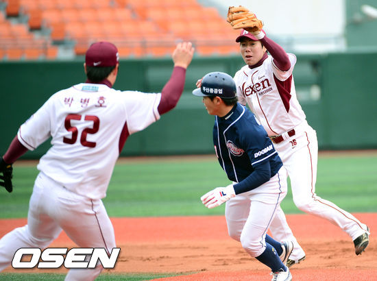 22일 오후 서울 목동구장에서 열린 '2013 한국야쿠르트 세븐 프로야구' 넥센 히어로즈와 두산 베어스의 시범경기, 3회 무사 1루 넥센 강정호가 런다운에 걸린 정수빈을 태그아웃 시키려 하고 있다.