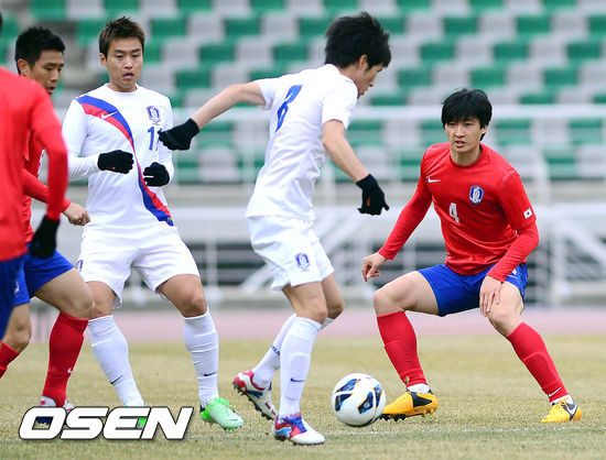 22일 오후 고양종합운동장에서 열린 축구 대표팀 자체 평가전에서 곽태휘와 한국영이 볼 다툼을 하고 있다.