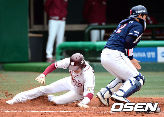 7회말 1사 1루 넥센 유한준의 안타때 1루주자 유재신이 슬라이딩으로 두산 최재훈의 블로킹을 피해 득점을 올리고 있다. / youngrae@osen.co.kr