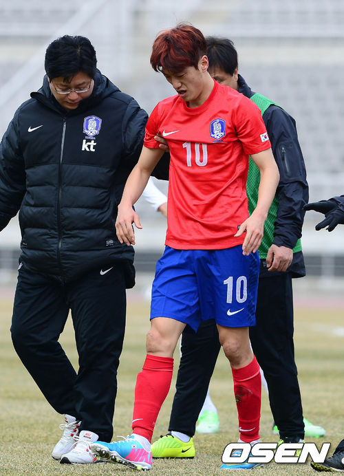 22일 오후 고양종합운동장에서 열린 축구 대표팀 자체 평가전에서 부상을 당한 이청용이 그라운드 밖으로 걸어 나가고 있다.