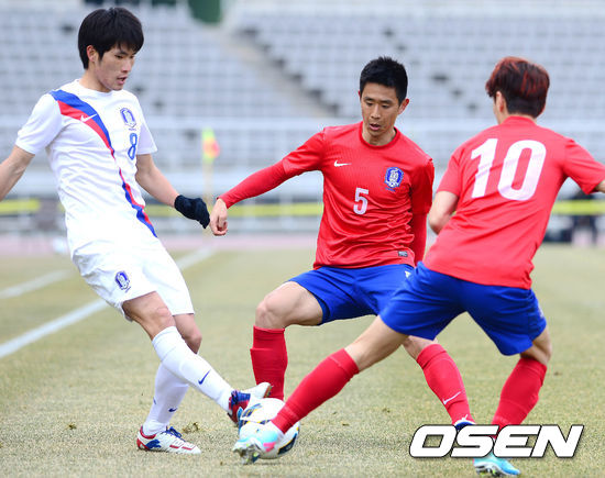 22일 오후 고양종합운동장에서 열린 축구 대표팀 자체 평가전에서 한국영-오범석-이청용이 볼다툼을 하고 있다.