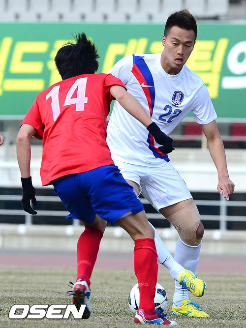22일 오후 고양종합운동장에서 열린 축구 대표팀 자체 평가전에서 김신욱이 한국영 앞에서 문전돌파를 시도하고 있다.