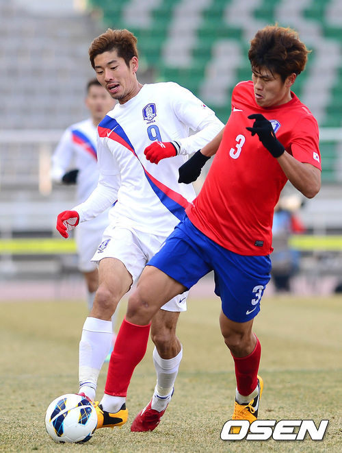 22일 오후 고양종합운동장에서 열린 축구 대표팀 자체 평가전에서 하대성, 정인환이 볼다툼을 하고 있다.
