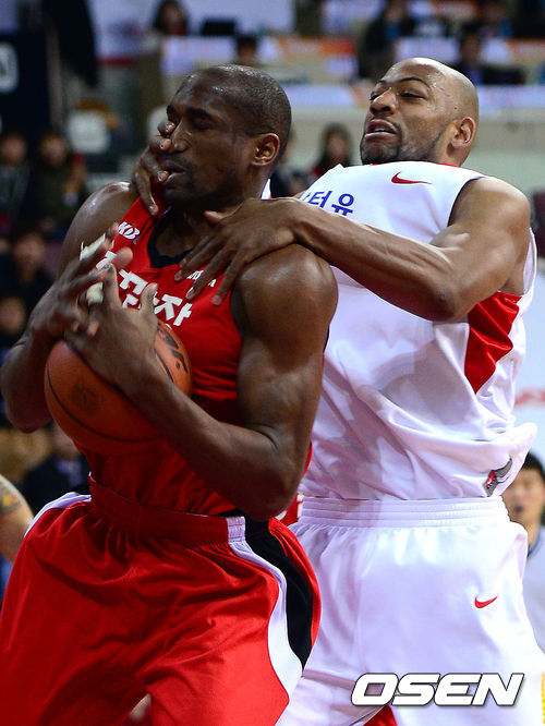 22일 오후 안양 실내체육관에서 열린 'KB 국민카드 2012-2013 프로농구' 6강 플레이오프 1차전 안양 KGC와 고양 오리온스의 경기 1쿼터 KGC 키브웨와 오리온스 윌리엄스가 리바운드 다툼을 벌이고 있다.