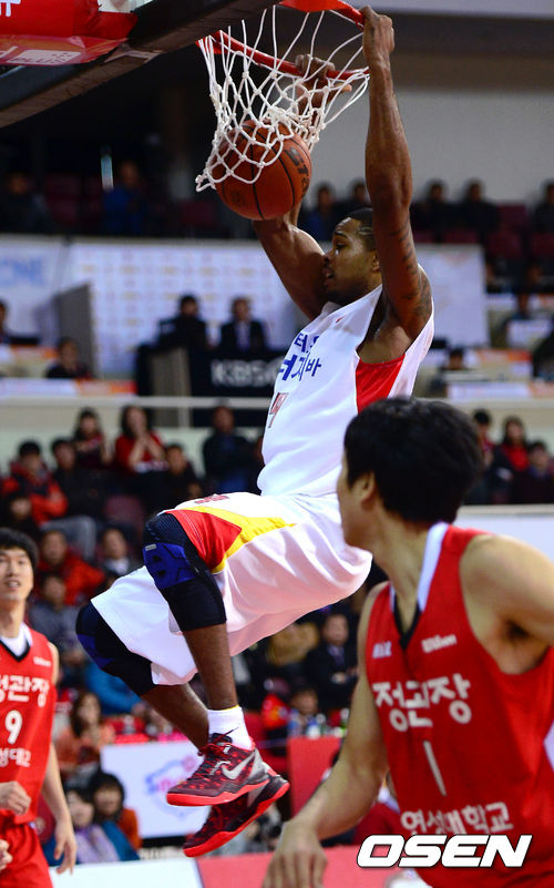 22일 오후 안양 실내체육관에서 열린 'KB 국민카드 2012-2013 프로농구' 6강 플레이오프 1차전 안양 KGC와 고양 오리온스의 경기 3쿼터 오리온스 테일러가 덩크를 하고 있다.
