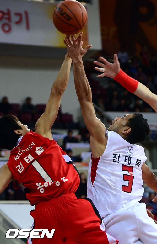 22일 오후 안양 실내체육관에서 열린 'KB 국민카드 2012-2013 프로농구' 6강 플레이오프 1차전 안양 KGC와 고양 오리온스의 경기 4쿼터 KGC 김태술이 오리온스 전태풍의 레이업슛을 블로킹으로 막아내고 있다.