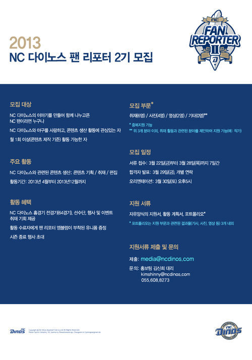 'NC 다이노스 팬 리포터' 모집에 대한 자세한 내용은 구단 홈페이지(www.ncdinos.com), 페이스북(www.facebook.com/ncdinos), 트위터(www.twitter.com/ncdinos_fan), 미투데이(http://me2day.net/ncdinos)를 참고하면 된다.