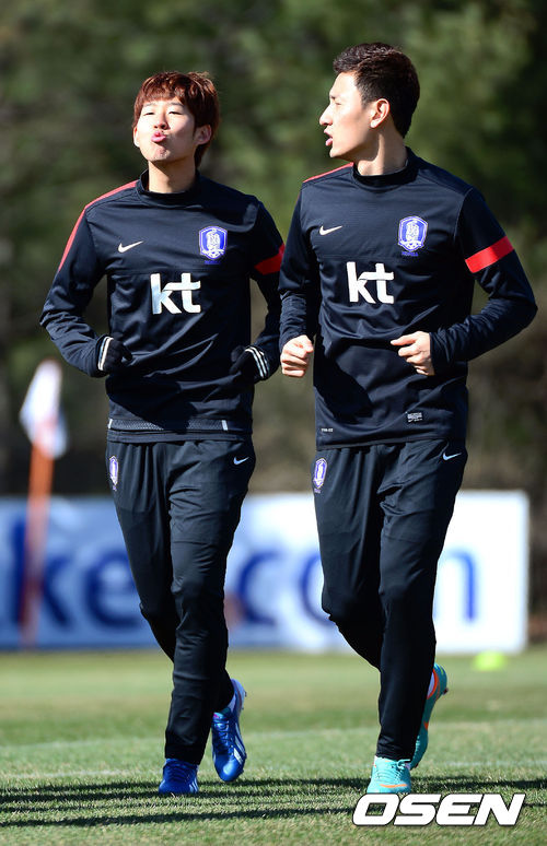 23일 오전 경기 파주 축구 국가대표팀 트레이닝 센터(NFC)에서 열린 대표팀 훈련에서 손흥민과 지동원이 러닝 훈련을 하며 장난을 치고 있다.