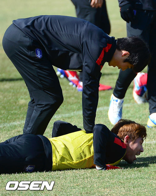 기성용이 팔굽혀펴기를 하고있는 하대성에게 장난을 치고 있다.