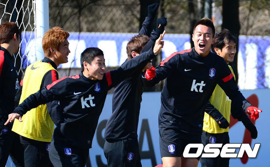 자체 미니게임에서 골을 넣은 이근호와 김신욱이 기뻐하고 있다.