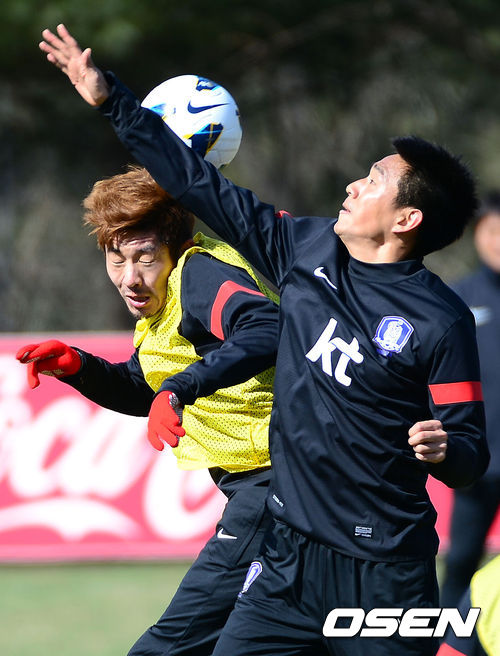 하대성과 오범석이 공중볼 다툼을 벌이고 있다.