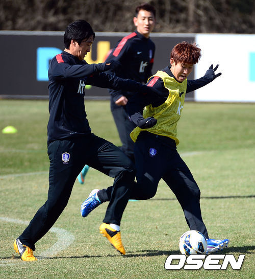 자체 미니게임에서 손흥민과 곽태휘과 볼타툼을 벌이고 있다.