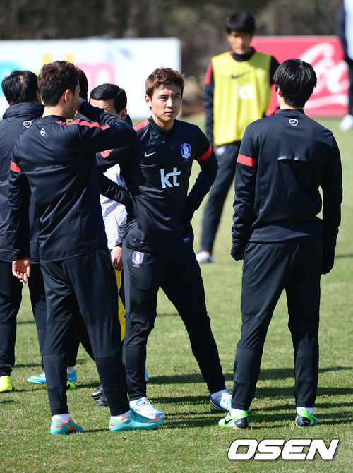 세트피스 훈련에서 구자철이 지동원, 기성용과 이야기를 나누고 있다.