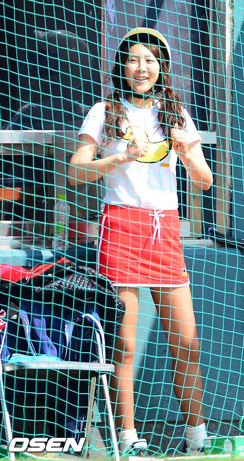 LG 배트걸 김민지가 그물망 뒤에서 음악에 맞춰 춤을 추고 있다.
